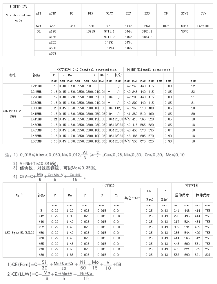 L450(X65)、L485(X70)、L555(X80)、L290NB/MB(X42N/M)、L360NB/MB(X52N/M)、L390NB/MB(X56N/M)、L415NB/MB(X60N/M)、L450MB(X65)、L485MB(X70)、L555MB(X80)。