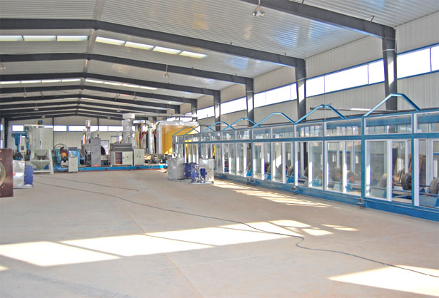 3PE纏繞作業(yè)線:采用靜電噴涂原理,潔凈且具有一定粗糙度的鋼管旋轉的通過中頻加熱室,使管體達到一定溫度后,隨即進入粉末噴涂室,利用流化床、靜電發(fā)生器及噴槍向鋼管表面噴涂形成所需的涂層厚度;再通過擠出機,分別擠出膠粘齊、聚乙烯纏繞到螺旋前進的鋼管上。再經(jīng)水冷系統(tǒng)、在線檢測,管端打磨,即為成品管。