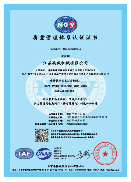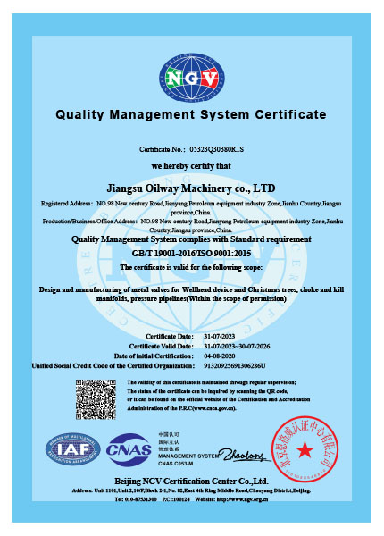 我們一直秉著質(zhì)量可靠、用戶至上的理念為客戶提供服務(wù),公司先后取得API6A,API6D,API16A,API16C,CE,TRCU (EAC),API6FA,ISO9001,ISO14001,ISO45001等國際認證,使我們能更加規(guī)范化的按照標準及客戶要求,提供優(yōu)質(zhì)產(chǎn)品。