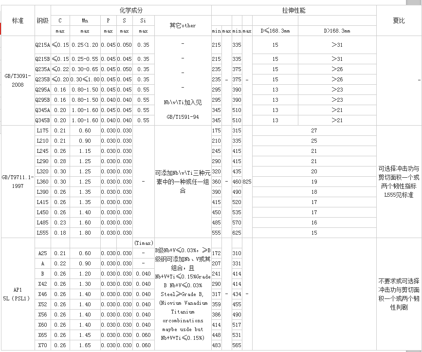 L450(X65)、L485(X70)、L555(X80)、L290NB/MB(X42N/M)、L360NB/MB(X52N/M)、L390NB/MB(X56N/M)、L415NB/MB(X60N/M)、L450MB(X65)、L485MB(X70)、L555MB(X80)。
